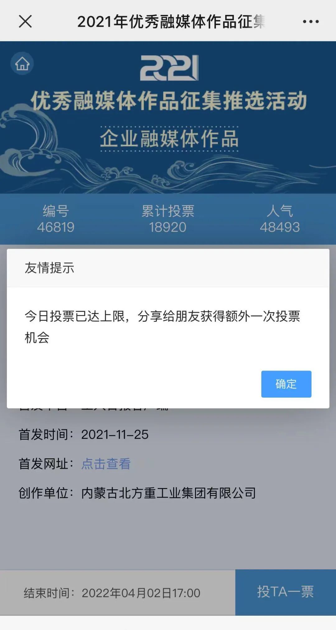 近日,由“文化強國”光明日報協(xié)同推廣平臺、光明網(wǎng)、北京師范大學新媒體傳播研究中心和光明天翼5G融媒實驗室共同主辦的“2021年優(yōu)秀融媒體作品征集推選活動”開啟線上投票環(huán)節(jié),經(jīng)過專家委員會評審,中國兵器工業(yè)集團北重集團《白楊伴我獻國防》音樂MV入選活動前二十名,并進入網(wǎng)絡投票環(huán)節(jié)。 《白楊伴我獻國防》 楊樹參天 高聳云端的是兵工人 “履行好強軍首責”的壯志凌云! 深植北疆 傾獻沃土的是北重人 “推動高質(zhì)量發(fā)展”的壯志豪情! 白楊樹伴著我們茁壯成長 見證著我們獻身國防! 投票方式 1.掃描下方二維碼,進入初始界面,點擊“企業(yè)融媒體作品征集”,進入投票界面點擊《白楊伴我獻國防》,點擊“投TA一票”; 2. 每人每日可投10票,直至提示投票達到上限即可; 3.投票時間:2022年3月17日09:00-2022年4月2日17:00。 來源/光明網(wǎng)、北重集團 |