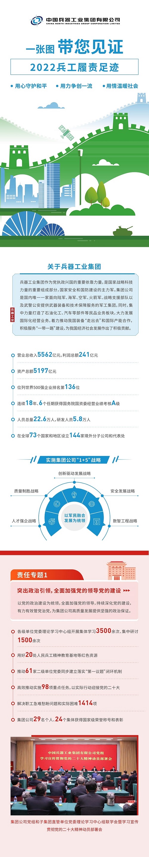 《中國兵器工業(yè)集團有限公司2022年社會責任報告》(以下簡稱《報告》)是集團公司發(fā)布的第十四份年度社會責任報告,經中國企業(yè)社會責任報告評級專家委員會評定,《報告》第四年獲得“五星佳”最高評級。 《報告》開篇設置“突出政治引領,全面加強黨的領導黨的建設”“沙場‘秋’點兵,中國兵器閃耀亮相珠海航展”兩個責任專題,聚焦集團公司加強黨建、強軍報國的擔當作為,書寫集團公司在新時代新征程上的奮進答卷。主體章節(jié)以“用心守護和平、用力爭創(chuàng)一流、用情溫暖社會”為主題,從恪守強軍首責、服務經濟建設、共創(chuàng)美好生活三個維度展現了集團公司立足“1+5”戰(zhàn)略和“雙十”規(guī)劃,聚焦新時代新征程新任務高質量履行政治責任、經濟責任和社會責任的具體行動和成效亮點,詮釋了集團公司服務國家戰(zhàn)略、服務國防和軍隊現代化建設、服務國家經濟社會發(fā)展的職責使命。 文/社會責任部 |